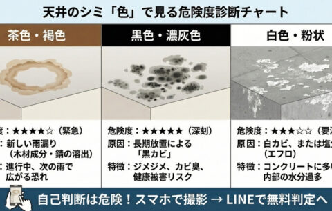 天井のシミ、茶色?黒色?それとも白?「シミの色」でわかる雨漏りの危険度と原因菌(カビ)